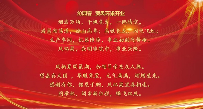 省合作交流办公室陈龙主任,安徽省巢湖市委常委、组织部张金平部长,双凤钢构董事长汪建环和凤环巢总经理王文明一同为新厂剪彩。张金平部长还发表了重要讲话,肯定了凤环巢建成快、试营业成绩好、同时对凤环巢提出了做强做大的希望。随后双凤公司董事长汪建环、安徽省钢结构协会秘书长朱华也发表了祝词,凤环巢总经理王文明也做了工作汇报。庆典仪式结束后,总经理吴正江于巢湖市国际饭店的午宴上,助兴诗作一首,为凤环巢送上美好祝福。